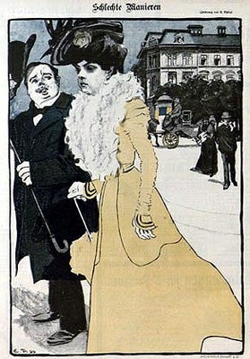 As you can see, the textual explanation of the notation contains both words. Please note that all the other words shown here can also be used for retrieval if the notation 33A11 is transferred to a user’s database.The same gesture, but in a very different context and in a very different catalogue: according to the caption, the lady shows ‘Schlechte Manieren‘ (bad manners) by completely ignoring the gentleman who is politely lifting his hat in salute.