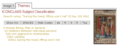 RKD’s Iconclass system can now be directly connected to online catalogues like these. Thus it can help both the indexer who has to decide which concepts (notations) to copy from the system, and the end user of the catalogue who simply wants to ask for scenes of people lifting their hat, not knowing anything about this or any other notation. So, in your own online catalogue, you merely need to have the Iconclass notations in place to allow for keyword retrieval. With the help of the same Iconclass system, you will also be able to display the meaning and context of a notation. Thus:
